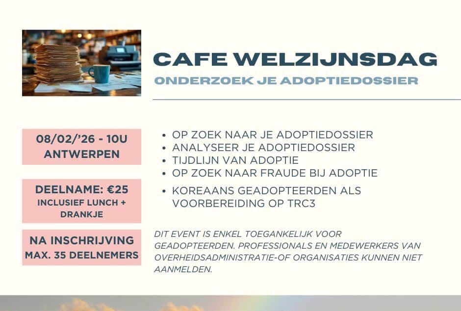 CAFE organiseert op zondag 8 februari 2026 een Welzijnsdag voor geadopteerden die hun adoptiedossier willen onderzoeken. Je gaat zelf aan de slag met ondersteuning en begeleiding van het CAFE team, dus breng je adoptiedossier mee!
