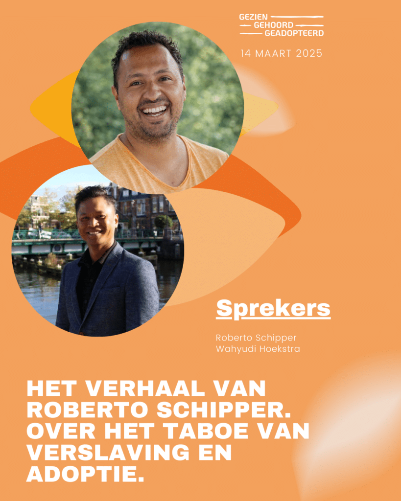 Verslaving is een onderwerp waar nog steeds een groot taboe op rust — ook binnen de adoptiegemeenschap. Toch komt verslavingsproblematiek onder geadopteerden relatief vaak voor. Er lijkt weinig ruimte om dit open en veilig te bespreken. In deze workshop bundelen Roberto Schipper en Wahyudi Hoekstra hun krachten. Samen onderzoeken zij hoe vroegkinderlijk trauma – zoals afstand & adoptie – invloed kan hebben op het leven van een mens. Hoe dit kan doorwerken in gevoel en gedrag en waarom dit kan leiden tot verslavingsgedrag. Deze workshop is nadrukkelijk géén therapiesessie, maar een inspiratiesessie. Een informatieve en verbindende bijeenkomst waarin kennis, herkenning en bewustwording centraal staan. En geeft een inkijkje over hoe bewustwording ook tot hoop en herstel kan leiden. De workshop is toegankelijk voor iedereen — of je nu zelf ervaring hebt met verslaving of simpelweg geïnteresseerd bent in dit thema.